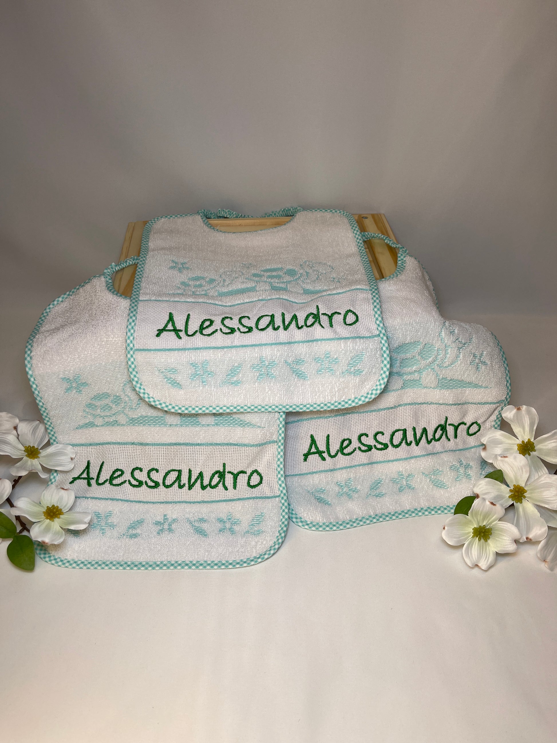 Realizzato in cotone e impreziosito da una fascia in tela aida, perfetta per il ricamo personalizzato del nome.