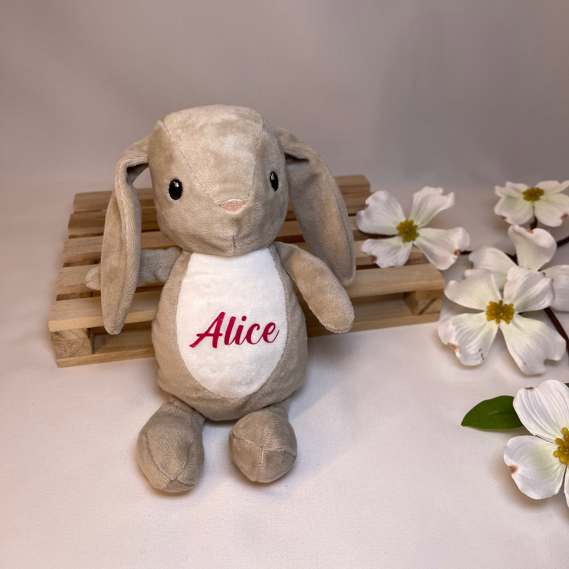 Realizzato in peluche morbidissimo, ha lunghe orecchie da accarezzare e una pancia personalizzabile con il nome del piccolo o una parola speciale.