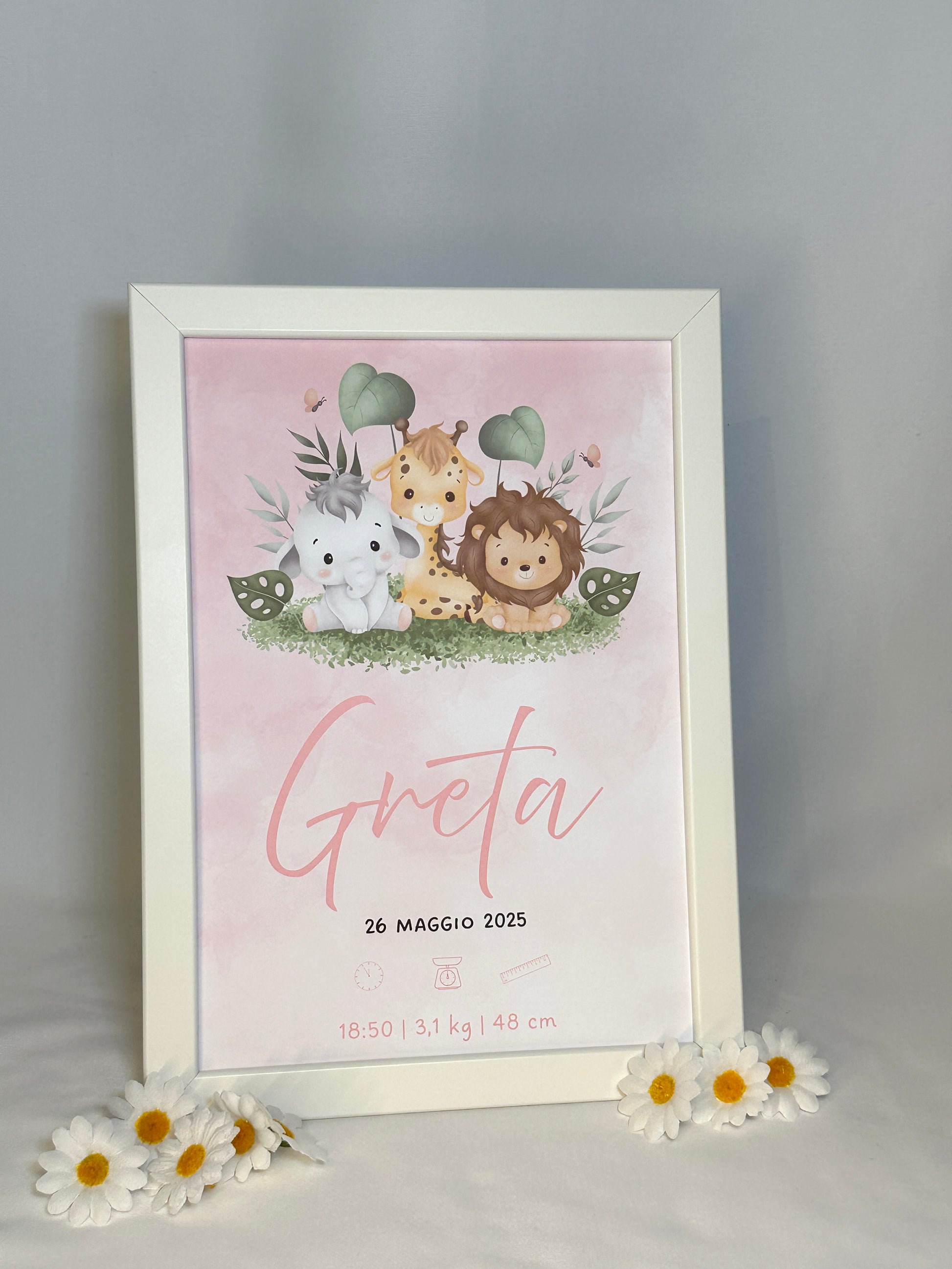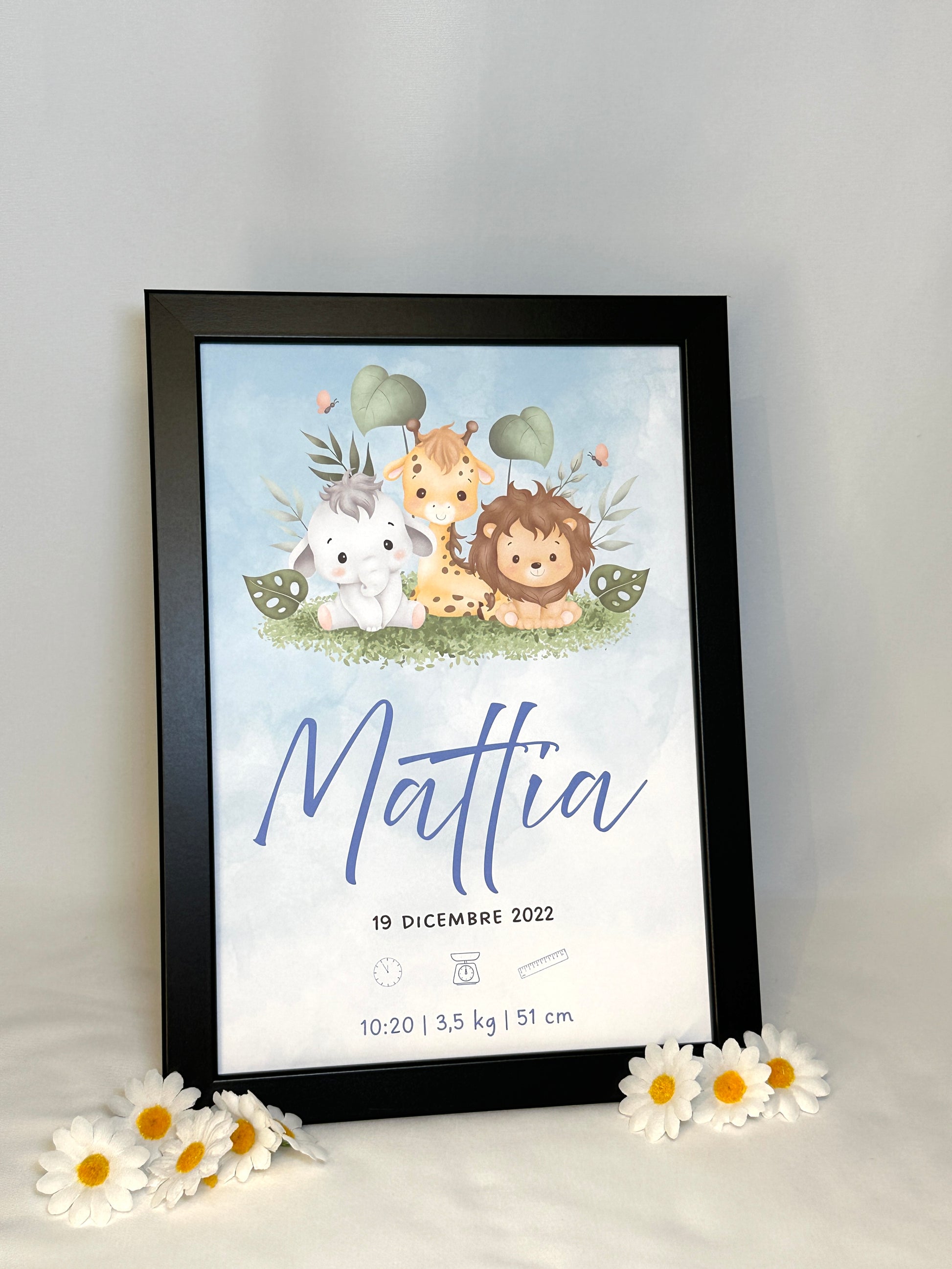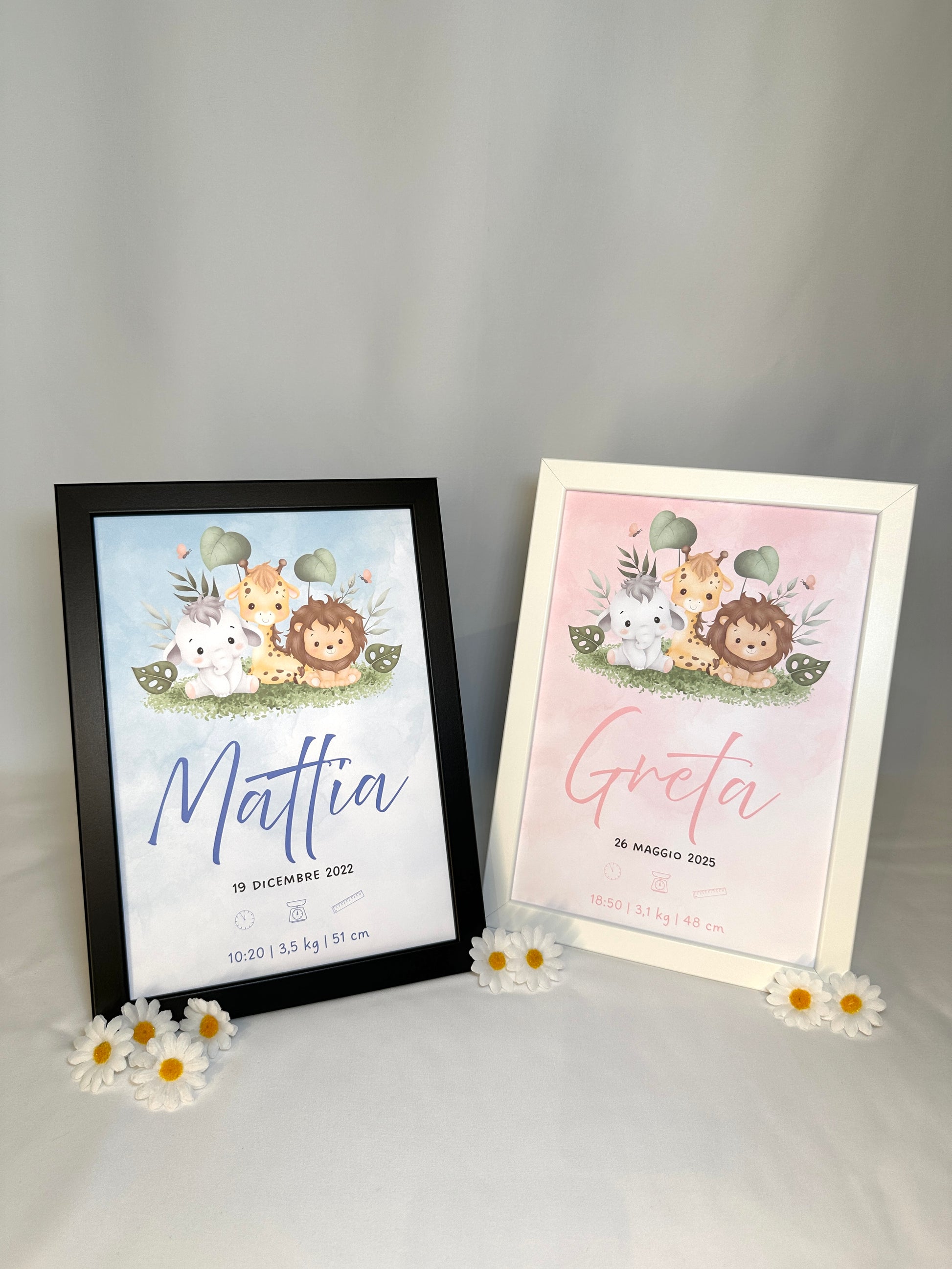 La stampa include i dati principali del bambino: Nome, data, orario di nascita, peso e altezza, rendendo ogni quadretto un pezzo unico.