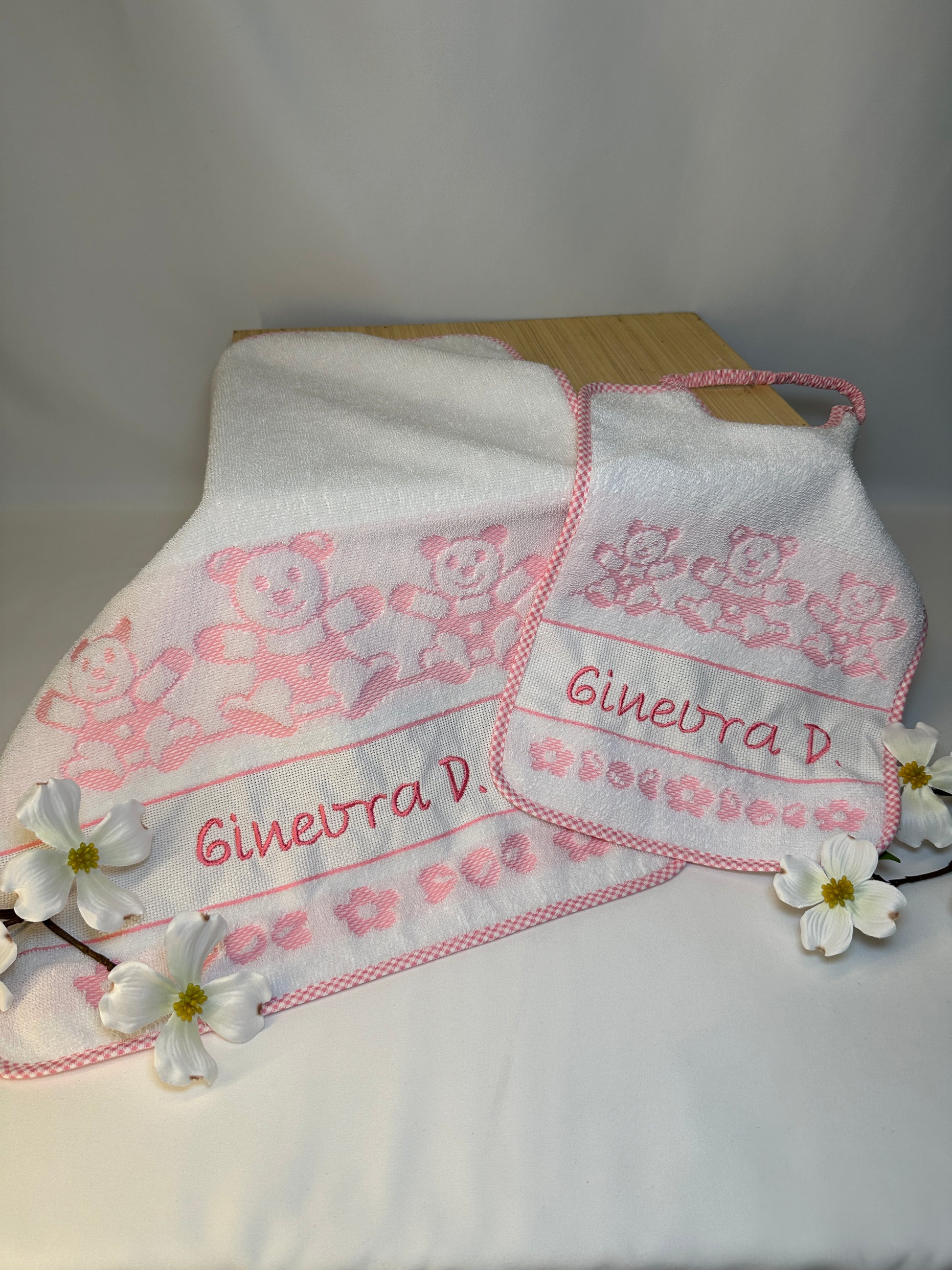 Composto da una bavaglia e un asciugamano coordinati, entrambi realizzati in morbida spugna di cotone e impreziositi da una fascia in tela aida, perfetta per il ricamo personalizzato del nome.
