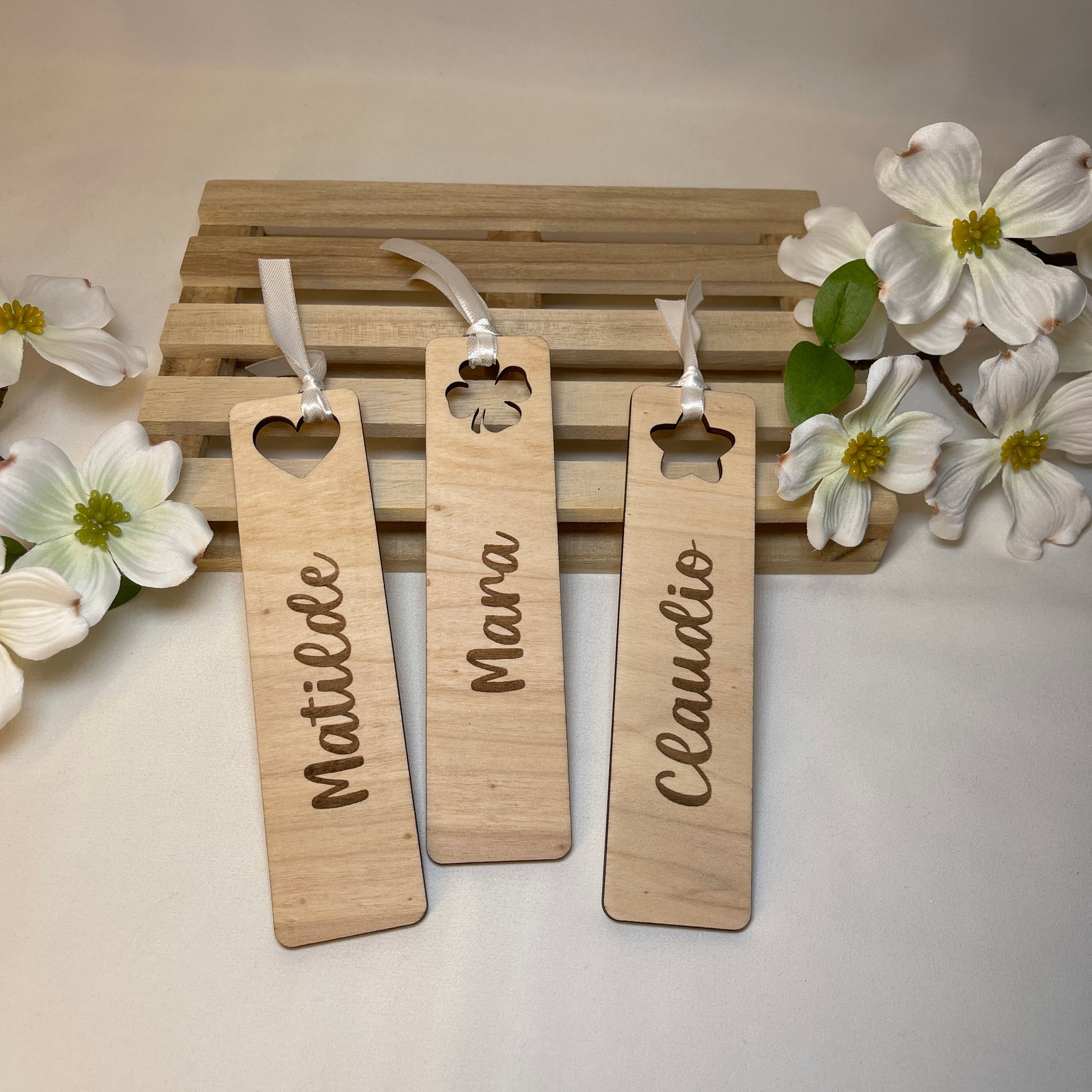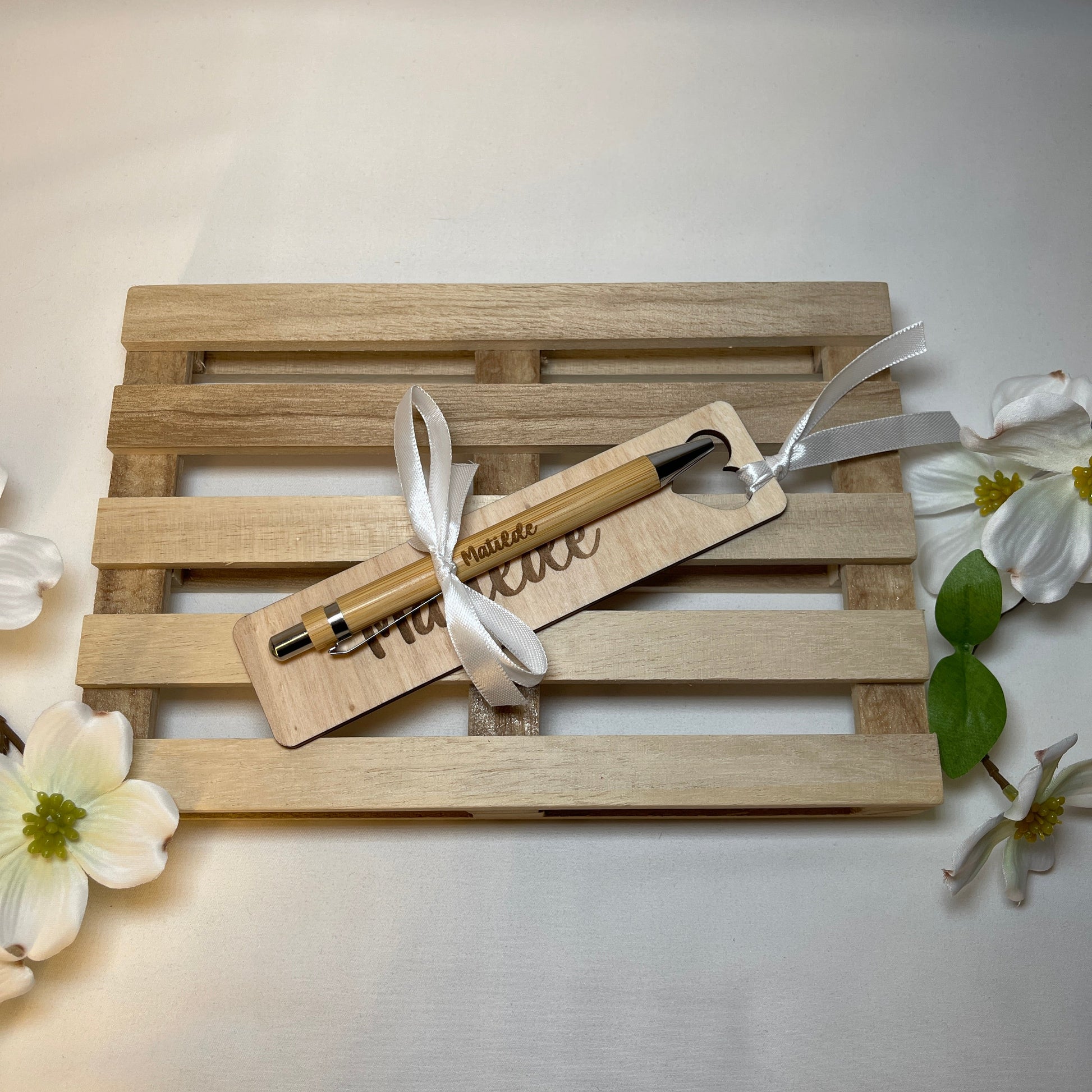 Il nostro set artigianale è composto da un segnalibro in legno inciso a laser con il nome o simbolo che preferisci e da una penna coordinata, anch’essa personalizzata con cura.